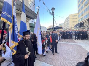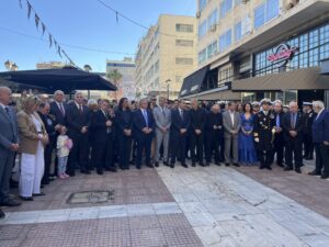 Ακολούθησε επιμνημόσυνη δέηση υπέρ αναπαύσεως των πεσόντων, ενώπιων του ηρώου του Θεόδωρου Κολοκοτρώνη στον πεζόδρομο Δραγάτση και κατάθεση στεφάνων.