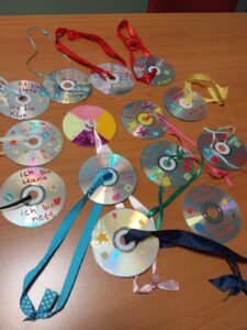 Οι μαθητές/τριες της Γ΄ Δημοτικού έδωσαν νέα ζωή σε παλιά CD, δημιουργώντας προσωπικά μετάλλια με λέξεις και φράσεις στα Γερμανικά που εκφράζουν συναισθήματα, αξίες και αγάπη για το περιβάλλον.